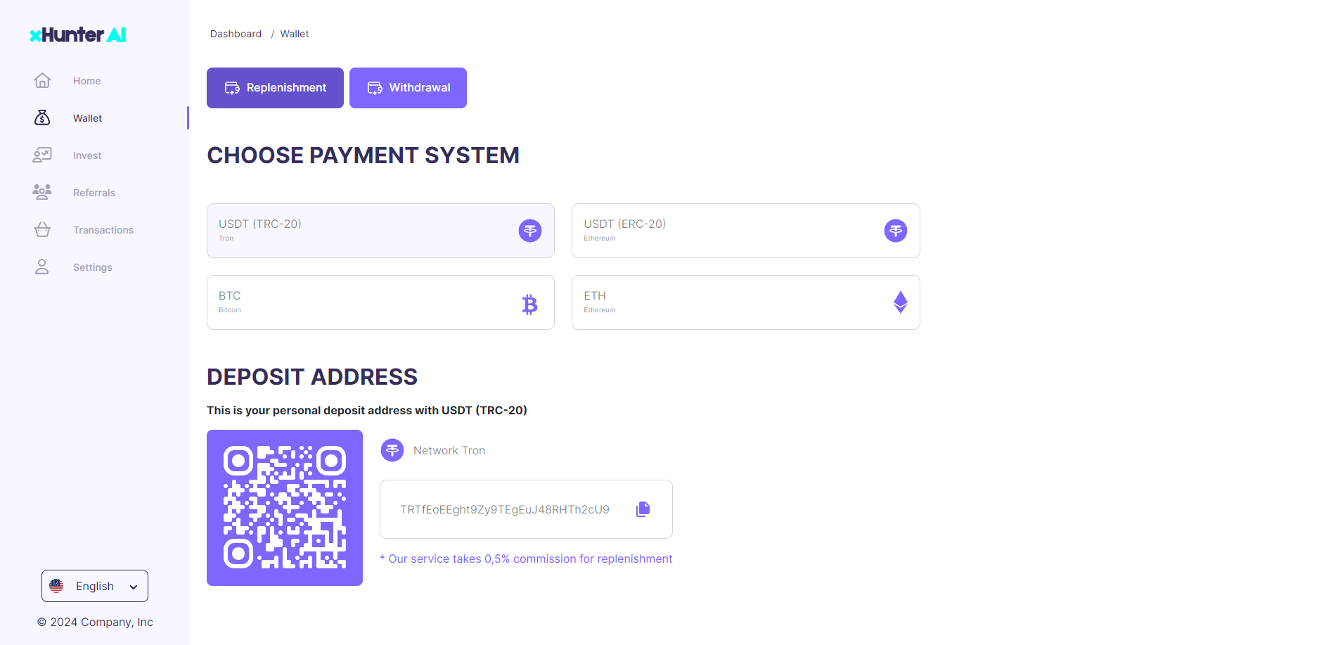 The first step to fund your account on xHunter AI is to log into your account on the platform. After a successful login, navigate to the "Wallet" section on the platform's homepage. Then select the "Replenishment" section.