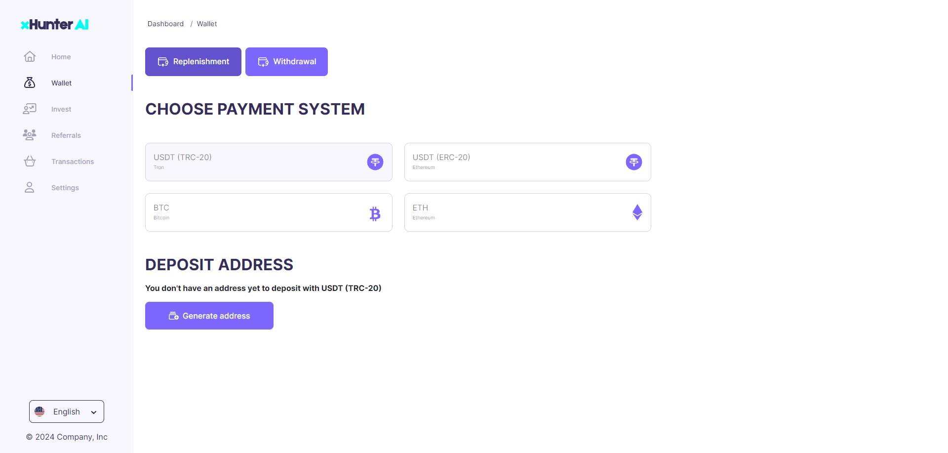The first step to funding your account on xHunter AI is to log into your account on the platform. After successfully logging in, you need to fund your balance for further investment.