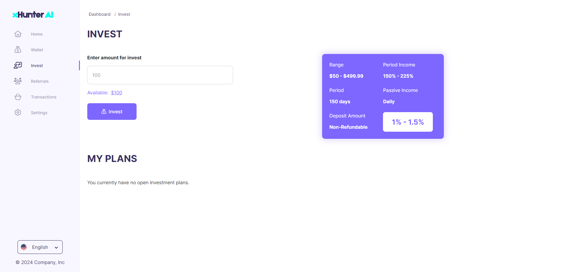 Here, you will find information about the current performance, profit, and other statistical data related to your investments. This allows you to meticulously track and manage your investments on the xHunter AI platform.